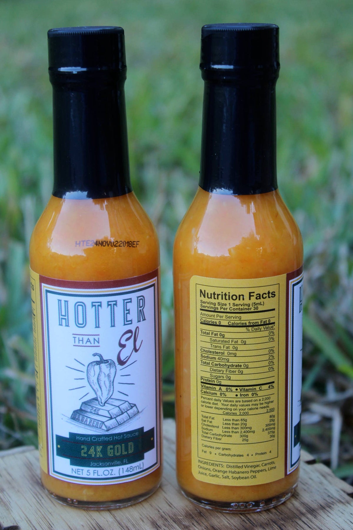 Hotter Than El presents the 24 Karat Gold Hot Sauce, an award-winning Caribbean style condiment. This sauce is a harmonious blend of distilled vinegar, carrots, onions, orange habanero peppers, lime juice, garlic, salt, and non-gmo canola oil. It promises a flavor-first experience with no added sweeteners or sugars, making it a perfect choice for spice lovers and diabetics alike. With a shelf life of 24-36 months, this shelf-stable sauce is sure to add a golden touch to your meals. Enjoy the heat responsibly!