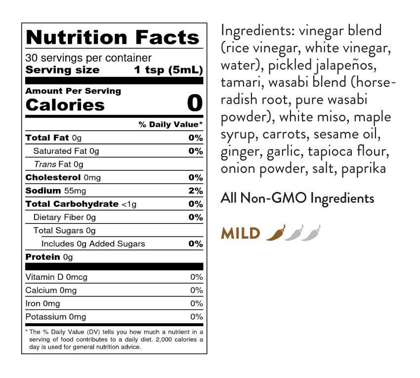vinegar blend (rice vinegar, white vinegar, water), pickled jalapeños, tamari, wasabi blend (horseradish root, pure wasabi powder), white miso, maple syrup, carrots, sesame oil, ginger, garlic, tapioca flour, onion powder, salt, paprika
