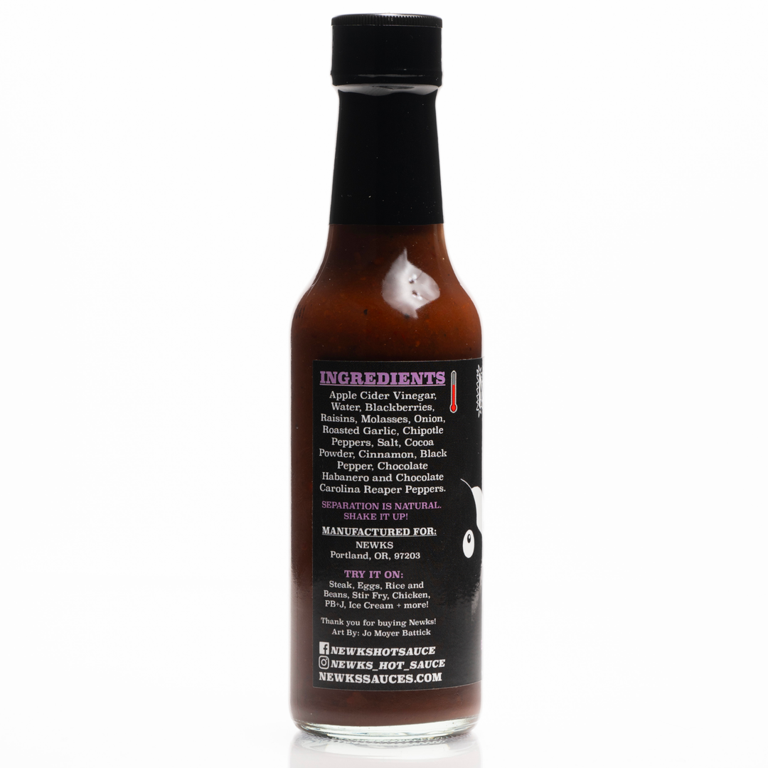 Apple Cider Vinegar, Blackberries, Raisins, Onion, Garlic, Chipotle Peppers, Molasses, Salt, Cocoa Powder, Cinnamon, Black Pepper, Chocolate Habanero, Chocolate Carolina Reaper Peppers